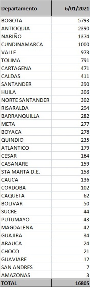 El Ministerio de Salud y Protección Social reportó, este miércoles 6 de enero de 2021, 16.805 casos nuevos de coronavirus en Colombia. En las últimas 24 horas se procesaron 67.277 pruebas de las cuales 33.751 son PCR y 33.526 de antígenos.