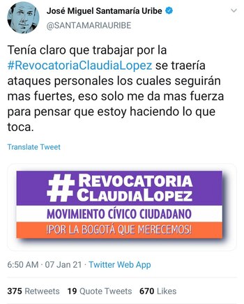 Algunos de ellos lo han hecho desde sus cuentas personales, como es el caso de José Miguel Santamaría Uribe, quien desde el 18 de noviembre del año pasado confirmó que estaba trabajando en la revocatoria de Claudia López y constantemente critica las medidas que toma la alcaldía de la capital, especialmente sobre la pandemia.