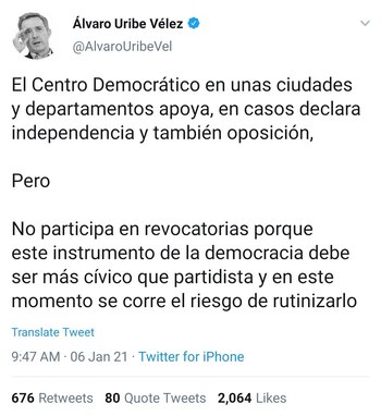 El expresidente Álvaro Uribe Vélez afirmó a través de sus redes sociales que, “estas deben ser iniciativas ciudadanas y no partidistas”, por lo que afirmó que el Centro Democrático no respaldará ninguno de estos procesos.