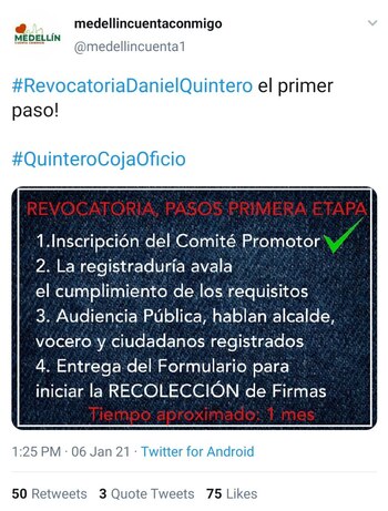 Otros ciudadanos, decidieron crear cuentas colectivas, como el colectivo Medellín Cuenta Conmigo, quienes el primero de enero lograron llegar a ser tendencia en el país con #AdiosDanielQuintero. Este grupo inscribió, el pasado 4 de enero, la solicitud ante la Registraduría de su ciudad.
