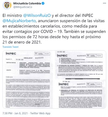 El ministerio de Justicia y el INPEC anunciaron a través de las redes sociales del Instituto Nacional Penitenciario y Carcelario la suspensión de las visitas en todas las cárceles del país y de los permisos de 72 horas desde hoy, viernes 8 y hasta el próximo 21 de enero.