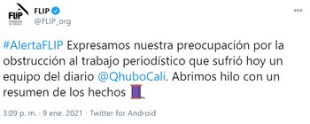 Frente a los hechos, la Fundación para la Libertad de Prensa expresó su preocupación por la obstrucción al trabajo periodístico que sufrió el equipo de Q’hubo Cali.