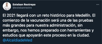El secretario de Gobierno de Medellín, Esteban Restrepo, confirmó que el 2021 llegará con un reto histórico para la capital paisa, “el comienzo de la vacunación será una de las pruebas más grandes para nuestra administración, sin embargo, nos hemos preparado con herramientas y estudios que apoyarán este proceso en la ciudad”, confirmó a través de sus redes sociales.