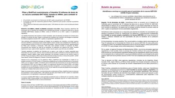 En ambos documentos se puede leer que cada laboratorio afirma que le proporcionará al país 10 millones de dosis de la vacuna, pero no especifica cuándo llegarán estas a Colombia. Astrazeneca menciona que el arribo sería durante el primer semestre del año, pero Pfizer es más amplio y dice que llegarán en “el transcurso del 2021”.