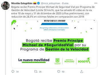 Nicolás Estupiñán, secretario de Movilidad, afirmó que “recibir este reconocimiento es muy importante para la ciudad, esto demuestra que vamos por buen camino, que estamos haciendo las cosas bien y que la medida a 50km/h implementada desde mayo de 2020 en la ciudad ha tenido resultados positivos”.