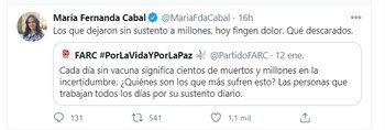 A los cuestionamientos de partidos como FARC (Fuerza Alternativa Revolucionaria del Común) por la incertidumbre sobre la llegada de las vacunas al país, han reaccionado simpatizantes uribistas como la Senadora María Fernanda Cabal, quien ha señalado a los exmilitantes de la guerrilla de “descarados”.