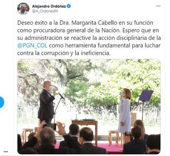 “Deseo éxito a la Dra. Margarita Cabello en su función como procuradora general de la Nación. Espero que en su administración se reactive la acción disciplinaria de la Procuraduría como herramienta fundamental para luchar contra la corrupción y la ineficiencia”, escribió Ordóñez en su cuenta de Twitter.