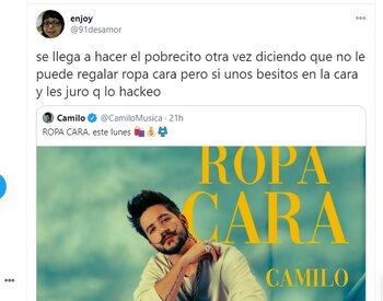 En medio de la espera, en Twitter ya se volvió tendencia la nueva canción que se titula ‘Ropa cara’ y el mismo Camilo, pues miles de vaticinan que el tema podría tratar, nuevamente, del artista haciendo de “pobre”, tal y como pasó con su éxito ‘Vida de rico’.