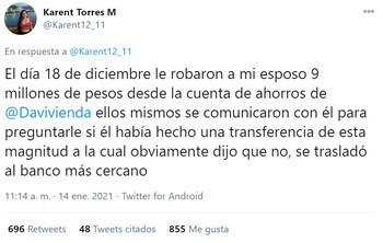 A través de su cuenta de Twitter, una usuaria identificada como Karent Torres denunció una complicada situación que le ocurrió a su esposo, Diego Fernando Arias, titular de una cuenta de ahorros del banco Davivienda: en cuestión de días, le fueron hurtados 12 millones de pesos.