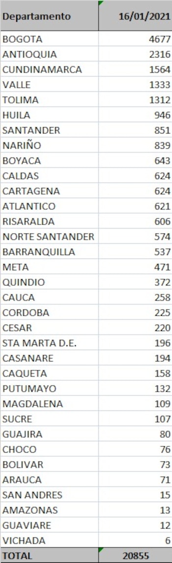 El Ministerio de Salud y Protección Social reportó, este sábado 16 de enero, 20.855 casos nuevos de coronavirus en Colombia. En las últimas 24 horas se procesaron 70.763 pruebas de las cuales 39.351 son PCR y 31.412 de antígenos.