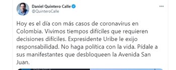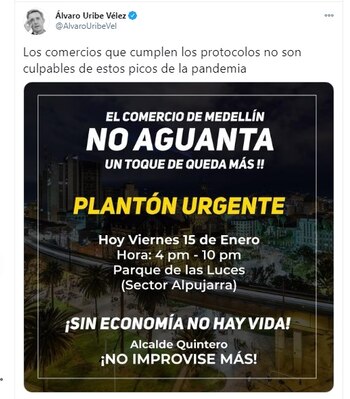 Ante esta convocatoria para que varios comerciantes afectados por el confinamiento salgan a protestar, el expresidente Álvaro Uribe les brindó su apoyo a través de su cuenta de Twitter. “Los comercios que cumplen los protocolos no son culpables de estos picos de la pandemia”, escribió el exmandatario y acompañó el trino con el poster que convoca el plantón.