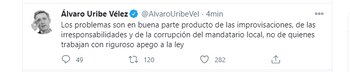 Minutos después, el exsenador Uribe volvió a trinar: “Los problemas son en buena parte producto de las improvisaciones, de las irresponsabilidades y de la corrupción del mandatario local, no de quienes trabajan con riguroso apego a la ley”.