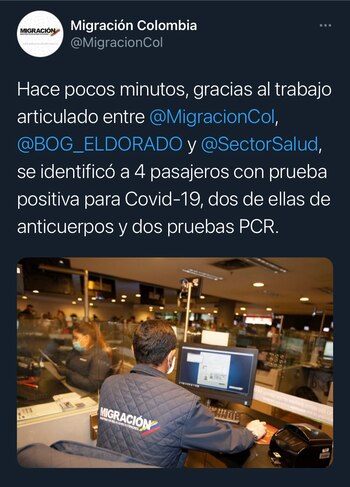 Felipe García, miembro de la junta directiva del sindicato de Migración Colombia habló con la emisora Blu Radio y reveló que el hombre aseguró tener una prueba PCR positiva que evidenciaba que tenía la enfermedad y que tan pronto llegó al país el vuelo 207 en el que se transportó la tripulación “inmediatamente fue enviado al área de sanidad”, expresó el funcionario, quien también evidenció la preocupación de los empleados de Migración sobre el papel de la aerolínea en estos casos.