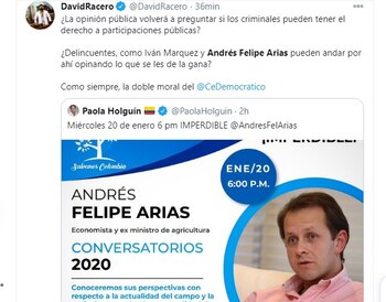Así mismo, el representante a la Cámara, David Racero, cuestionó: “¿La opinión pública volverá a preguntar si los criminales pueden tener el derecho a participaciones públicas? ¿Delincuentes, como Iván Márquez y Andrés Felipe Arias pueden andar por ahí opinando lo que se les de la gana? Como siempre, la doble moral del Centro Democrático”.