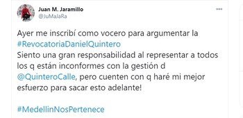 Jaramillo, además es uno de los promotores de la revocatoria del alcalde de Medellín, Daniel Quintero. Así lo expresó en su cuenta de Twitter: