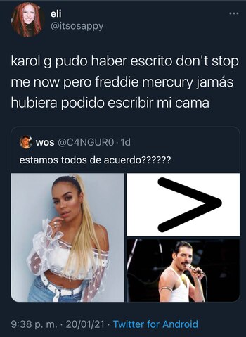 “Karol G es mejor que Freddie Mercury mil veces”; “Karol G es mejor que el Mercury”; “Karol G tiene más éxitos que Queen y Mercury; karol g pudo haber escrito Don’t Stop Me Now pero freddie mercury jamás hubiera podido escribir Mi Cama”, se lee entre algunos comentarios que defienden a la cantante.
