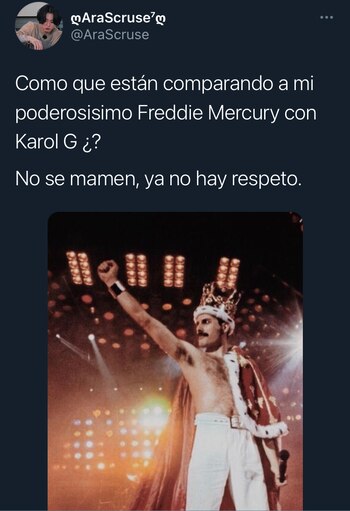 “Tienes que estar mal para comparar al rey Freddie Mercury con Karol G”; “No hay punto de comparación”; “¿Qué pasa con la persona que dijo que Karol G es mejor que Freddie Mercury? ¿Todo bien en casa? ¿Si asistimos a la escuela?”, se lee entre las reacciones que defienden al vocalista.