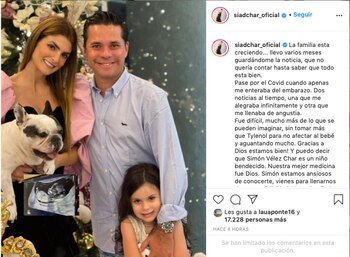 Luis Carlos Vélez y Siad Char confirmaron que están esperando a su segundo hijo. Así lo dejaron ver en sus redes sociales, con mensajes románticos en los que la pareja recordó lo felices que son dentro del matrimonio y con su familia. Además, la pareja ya escogió el nombre de su segundo heredero: se llamará Simón.