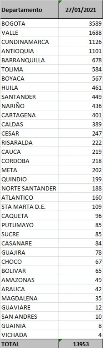 El Ministerio de Salud y Protección Social reportó, este miércoles 27 de enero, 13.953 casos nuevos de coronavirus en Colombia. En las últimas 24 horas se procesaron 74.125 pruebas de las cuales 46.603 son PCR y 27.522 de antígenos.
