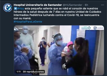 A través de un video que publicó el Hospital Universitario de Santander en sus redes sociales, se puede ver el emotivo momento en el que la mujer vuelve a recibir a su pequeña en brazos, después de haber estado sin ella los últimos días.