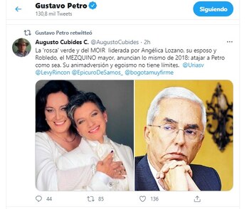 “La ‘rosca’ verde y del MOIR liderada por Angélica Lozano, su esposo y Robledo, el MEZQUINO mayor, anuncian lo mismo de 2018: atajar a Petro como sea. Su animadversión y egoísmo no tiene límites”, escribió el usuario de Twitter @AugustoCubides.