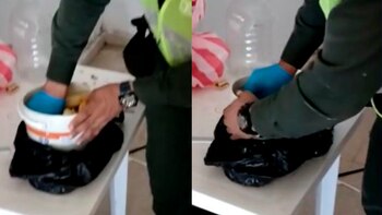 En redes sociales circula un video, publicado por la Mebar, del momento justo en el que los policías encuentran los elementos. En las imágenes se ve cómo uno de los uniformados, quien usa un guante quirúrgico, introduce su mano dentro de un balde mediano de color blanco que contenia la sopa. El funcionario notó inmediatamente que el recipiente tenía un doble fondo, así que empezó a levantarlo con ayuda de una cuchara.