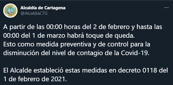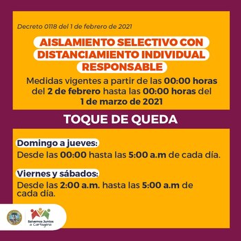 Para Cartagena seguirá habiendo toque de queda nocturno, el cual funcionará de la siguiente manera: de domingo a jueves comenzará a las 12:00 de la medianoche y finalizará a las 5:00 de la mañana. Los viernes y sábados empezará desde las 2:00 a.m. y terminará a las 5:00 a. m.