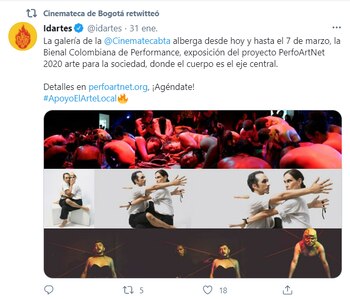 Desde el pasado 30 de enero, la Cinemateca Distrital dio a conocer, a través de sus redes sociales y de su página web, que la Bienal Colombiana de Performance “reúne varias propuestas de colombianos y colombianas para descubrir los múltiples intereses y las diversas soluciones que tienen los creadores de esta técnica de las artes plásticas y visuales, donde el cuerpo es el eje central, la herramienta o el medio para expresar lo que sentimos o pensamos”.