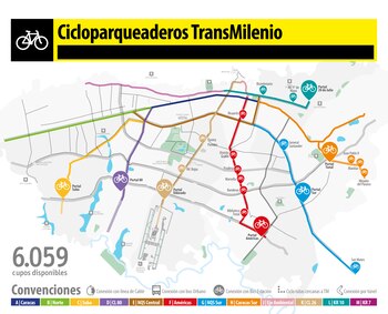 Según el informe de la entidad de transporte, actualmente existen 6.059 cupos disponibles en toda la red de cicloparqueaderos del sistema TransMilenio en Bogotá. Este es el mapa de la ciudad donde se encuentran cada uno de ellos: