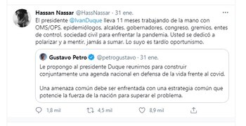 Petro escribió el pasado 31 de enero en su cuenta de Twitter: “Le propongo al presidente Duque reunirnos para construir conjuntamente una agenda nacional en defensa de la vida frente al covid. Una amenaza común debe ser enfrentada con una estrategia común que potencie la fuerza de la nación para superar el problema”.