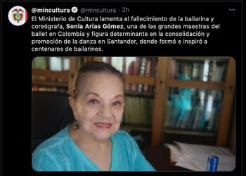 “La maestra Sonia Arias Gómez deja un extraordinario legado de creación y formación de generaciones completas de bailarines, que el mundo de la danza le reconocerá por siempre. Centenares de alumnos santandereanos que recibieron las enseñanzas de la maestra -y que hoy brillan en escenarios internacionales- son prueba viva de su maravilloso talento y don de servicio”, añadió.