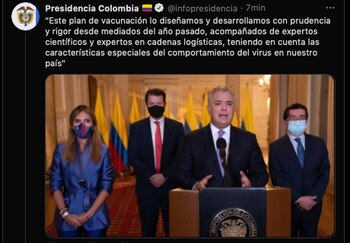 El plan de vacunación en Colombia cuenta con 2 fases y 5 etapas. “Iniciaremos vacunando a los hombres y mujeres que se encuentran en la primera línea de atención contra el covid y continuaremos avanzando, protegiendo a las poblaciones más vulnerables. A mayor edad, más comorbilidades y mayor exposición; más letal es el virus. Por eso, para ganar la batalla de la vida debemos vacunar cortándole el espinazo a la muerte: primero atendiendo al más vulnerable, al más expuesto, y luego ir llegando al más fuerte”, confirmó Duque.