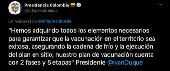 Además, dejó claro que ya está listo todo el plan de vacunación para lograr inmunizar a todos los colombianos en el tiempo determinado por el ministerio de Salud, “Hemos adquirido todos los elementos necesarios para garantizar que la vacunación en el territorio sea exitosa, asegurando la cadena de frío y la ejecución del plan en sitio; nuestro plan de vacunación cuenta con 2 fases y 5 etapas”, confirmó.