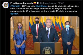 El presidente Iván Duque anunció que, desde Bélgica, llegará a Colombia el primer lote de vacunas contra el covid-19 al país. Se trataría de 50.000 dosis provenientes de la farmacéutica Pfizer, las cuales serán destinadas al personal de la salud que está en la primera línea de atención contra el virus.