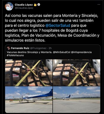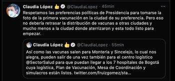 La alcaldesa de Bogotá, Claudia López, uso su cuenta de Twitter para, de manera pública, mostrarle al Gobierno Nacional su inconformismo frente al manejo de la entrega de las vacunas contra el covid-19 que llegaron al país el pasado 15 de febrero; aseguró que aunque respeta las preferencias de los mandatarios para tomarse la primer foto de vacunación en una ciudad lejana a la Capital del país, esto no debería retrasar la entrega de los fármacos en Bogotá, ya que según ella, la ciudad está lista para iniciar con el plan de vacunación.