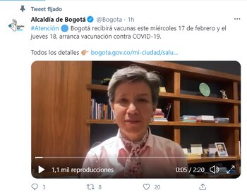 La alcaldesa Claudia López anunció en la noche de este martes que la vacunación contra el covid-19 comenzará el próximo jueves 18 de febrero en Bogotá desde las 7:00 a.m. La mandataria dio a conocer la información a través de un video en su cuenta de Twitter donde aclaró algunos puntos de la llegada de la vacuna a la capital.