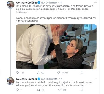 Este jueves 18 de febrero, el diplomático fue dado de alta tras superar la enfermedad y ya se encuentra en casa. Así lo informó él mismo en sus redes sociales: “De la mano de Dios regresé hoy a casa para abrazar a mi familia. Deseo lo propio a quienes están afectados por el Covid y son atendidos en los hospitales. Gracias a cada uno de ustedes por sus oraciones, mensajes y solidaridad: ahí está nuestra fortaleza”.