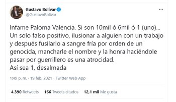 Por esta defensa de la senadora Valencia, el senador de oposición Gustavo Bolívar la tildó de “infame”: “Infame Paloma Valencia. Si son 10 mil o 6 mil ó 1 (uno)... Un solo falso positivo, ilusionar a alguien con un trabajo y después fusilarlo a sangre fría por orden de un genocida, mancharle el nombre y la honra haciéndole pasar por guerrillero es una atrocidad. Así sea 1, desalmada”.