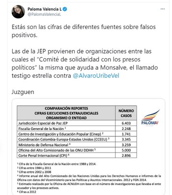 “Estás son las cifras de diferentes fuentes sobre falsos positivos. Las de la JEP provienen de organizaciones entre las cuales el “Comité de solidaridad con los presos políticos”, la misma que ayuda a Monsalve, el llamado testigo estrella contra Álvaro Uribe. Juzguen”, escribió la senadora en Twitter.