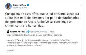 Por su parte, el senador Gustavo Petro también criticó a la congresista: “Cualquiera de esas cifras que usted presenta senadora, sobre asesinato de personas por parte de funcionarios del gobierno de Álvaro Uribe Vélez, constituye un crimen contra la humanidad”, dijo.