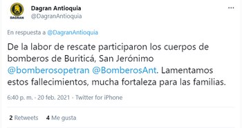 El Dagran Antioquia compartió en su cuenta de Twitter que un Consejo Municipal de Gestión del Riesgo de Buriticá reportó el accidente minero en la vereda Los Arados, “dejando como saldo 3 personas fallecidas y 2 más heridas por inhalación de gases químicos nocivos, tras acción explosiva. Nuestros profesionales apoyan al municipio”.
