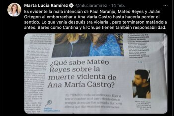 Recordemos que días antes, la vicepresidenta, Marta Lucia Ramírez, hizo una publicación donde comentó que Paul Naranjo y Julián Ortegón acusados de feminicidio y Mateo Reyes, uno de los testigos en el caso y que estuvo en el momento del accidente, querían violar a Ana María Castro y al no lograrlo la mataron.