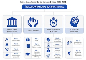 De acuerdo con el informe, a diferencia de la edición anterior, en esta oportunidad el Índice Departamental de Competitividad (IDC) no incluye grandes cambios en su estructura. No obstante, en esta ocasión el informe se conforma por 4 factores y 13 pilares. Entre ellos se encuentran: Instituciones, Infraestructura, Adopción TIC, Sostenibilidad Ambiental, Salud, Educación y Mercado Laboral.