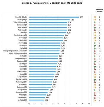 Dentro de los resultados generales, Bogotá incrementó marginalmente su puntaje frente al año anterior, lo que ubica a la ciudad en la primera posición del ranking general, al alcanzar una calificación de 8,33 sobre 10 en 2021. El segundo lugar lo ocupa Antioquia, que mantiene su posición respecto al año anterior y obtiene un puntaje de 6,80.