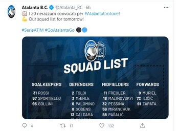 Previo a la convocatoria del encuentro ante el Crotone, anunciada en las redes sociales del Atalanta, Gasperini ya había dejado entrever lo que ocurría con el número 91: