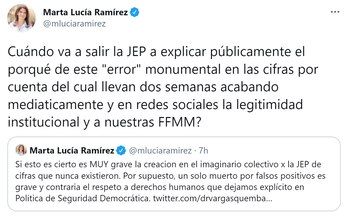 Pues bien, este 7 de marzo, la vicepresidenta Marta Lucía Ramírez, reiteró a través de su cuenta de Twitter, el llamado del Gobierno para que la JEP explique cómo llegó a la conclusión de estas cifras.