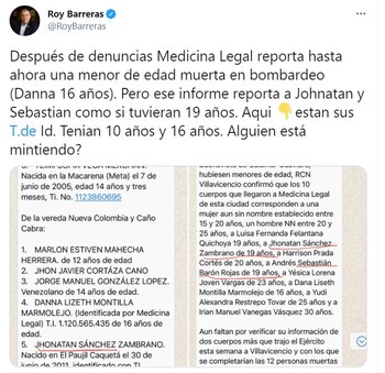 Respecto a esa información, el senador Roy Barreras, quien replicó la denuncia de Morris, señaló que la edad de dos de esos cuerpos, en comparación con sus documentos de identidad, serían niños de 10 y 16 años.