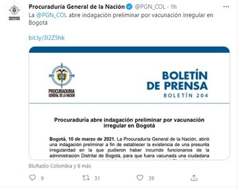 Pues bien, en la tarde de este 10 de marzo la Procuraduría General de la Nación dio a conocer que abrió una investigación preliminar, “a fin de establecer la existencia de una presunta irregularidad en la que pudieron haber incurrido funcionarios de la administración distrital de Bogotá para que fuera vacunada una ciudadana que no se encontraba priorizada en la primera etapa del Plan Nacional de Vacunación contra el covid-19.