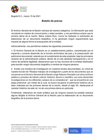 Entre tanto, el Archivo General de la Nación también publicó un comunicado en el que aseguraron que la esposa del presidente Duque no hizo dicha solicitud, donde, además, argumentaron que la institución no se prestaría para dichas labores.