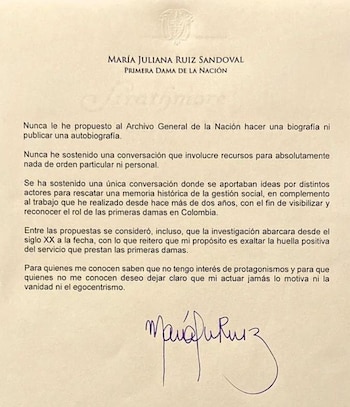 Ante la noticia, la primera dama de la Nación emitió un comunicado en el que explica que nunca hizo tal pedido, como lo aseguró Noticias Uno, medio que señaló además que, el requerimiento se habría hecho a través de una reunión virtual, donde se concretó la elaboración del libro que contaría su legado como primera dama de Colombia, el cual saldría a mediados del próximo año, cuando su esposo esté por salir de la Casa de Nariño.